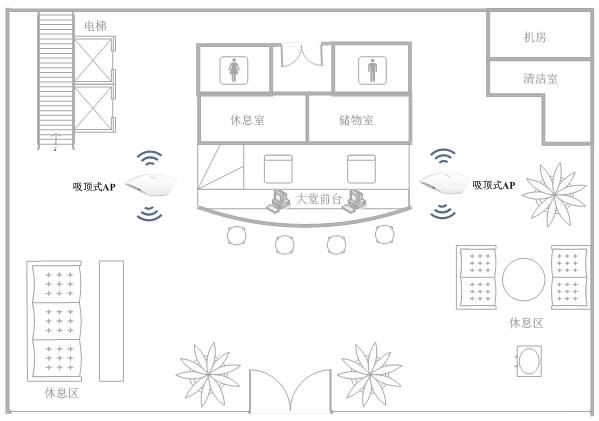 大堂相對空曠,阻隔物較少,吸頂式AP在空曠環(huán)境中覆蓋直徑20米,中小型酒店大堂可根據具體結構布置2-3個AP即可,大型酒店大堂可酌情增加,如下圖所示: